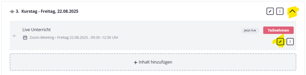 Info: Achte darauf, dass das geänderte Zoom-Meeting im richtigen Kurstag hinterlegt ist.