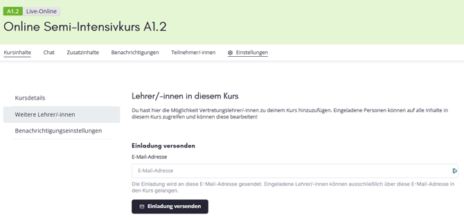 Du hast jederzeit die Möglichkeit, dich durch eine geeignete Lehrperson in deinem Kurs vertreten zu lassen. Dafür kannst du deine Vertretung wie folgt in deinen Kurs einladen:
