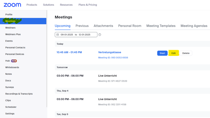 - Klicke beim entsprechenden Meeting auf Edit/Bearbeiten